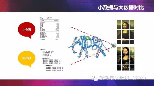 大數據的概念是相對小資料而言的。我們到招商銀行辦理信用卡的時候,招商銀行會讓您提供一段時間的工資單,這個工資單就是小資料,銀行憑藉工資單來對用戶的信用進行評價。現在有了所謂大數據的方式來評價客戶信用,比如您敲擊鍵盤的速度、錄入單詞的正確率,如果速度過慢、頻繁出錯,您的信用價值會降低,銀行的大數據信用評價系統認為IT不熟練的人士社會競爭力弱,信用價值理所當然低些;如果發現您經常玩遊戲連續超過2個小時,您的信用價值也會低,您會被銀行的大數據信用評價系統評價為玩物喪志者……大數據信用評價會有數萬個維度來評價一個人的信用,您的一言一行,只要在網上都會被記錄下來,作為您信用評價的一個維度;相對工資條的評價方式,不可謂不大。我們重視大數據評價一個人的信用價值時,千萬不可忽視小資料;任何一條資料都是您行為畫像的側寫,只有把大數據和小資料完美的結合,才能形成一副層次豐富、色彩飽滿的全息版數字油畫,否則因為缺乏工資這一條關鍵資料,本來畫蒙娜麗莎,結果卻畫成了憨豆先生。