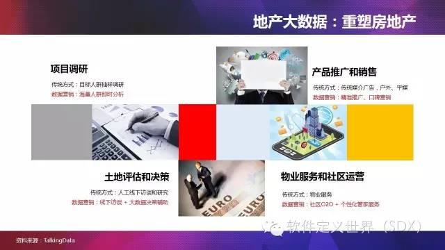 房地產行業正在被大數據重塑。以商鋪選址為例,過去調研公司在一個紅綠燈路口派8個人,點過往人頭,根據最低人流量來決定是否在該街角開家麥當勞。這種傳統的調研方式正在成為過去時,利用TalkingData覆蓋超過10萬款移動應用、累計36億台獨立智慧設備、每天處理數十億次會話請求資料,不但知道過去一個季度某個商業網點經過多少人、還知道多少外地人、更知道這些人過去一段時間去過多少次速食店,比傳統的調研方式更快、更準確的做出商業決策。